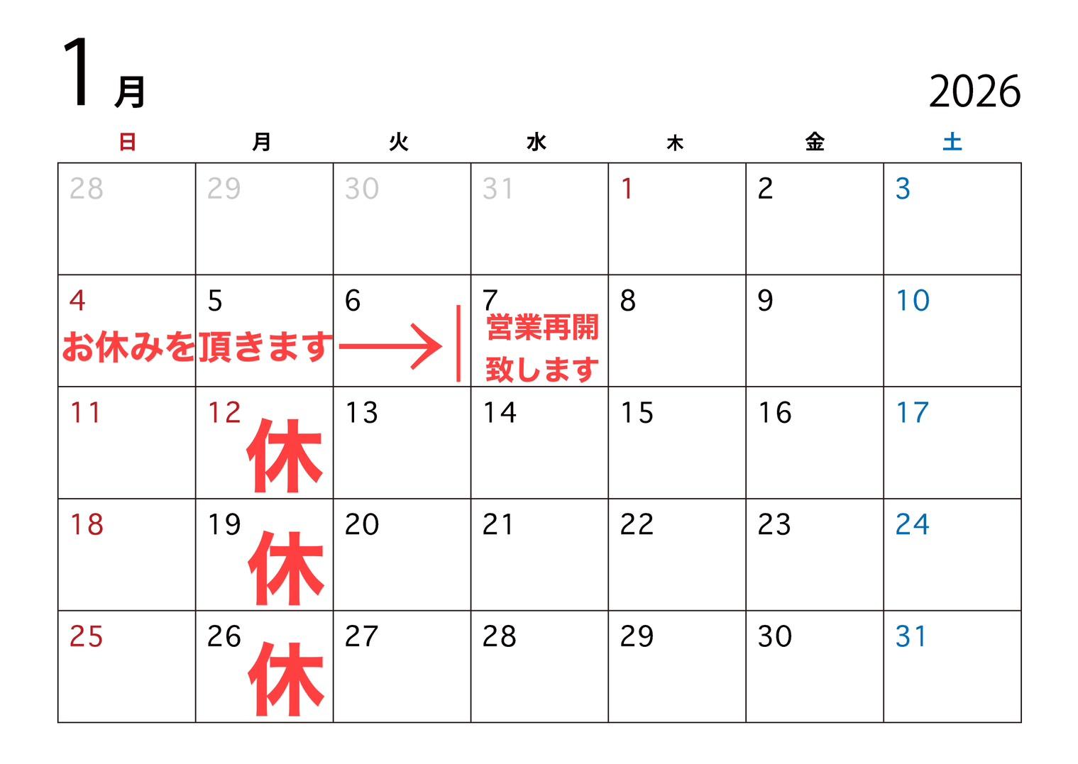 新年2026年1月7日(水)から新年営業スタートします。