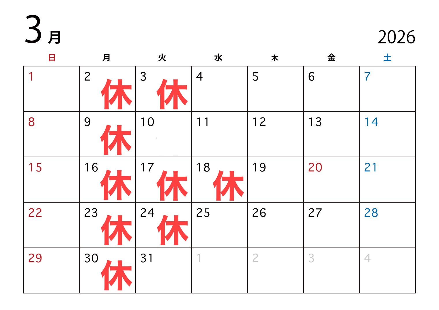 2026年3月の営業日